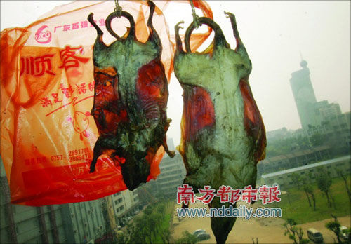 近日,佛山石湾一超市的腊味专柜出售的老鼠干。据超市员工称,称老鼠干很好卖,有顾客买了一次100多元的鼠干,反映蒸着吃味道很好。但鼠干是否可上市、属于哪种卫生许可或经营范围尚待进一步查实,当地卫监等部门已安排人员对事件展开调查。 台北新光三越上演万圣节“鬼脸”秀