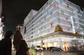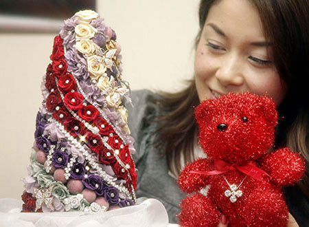 在日本首都东京的高岛屋总店,一名职员展示总售价约2亿日元(约合1351万元人民币)的一棵缀满钻石的圣诞树和与其配套的泰迪玩具熊。 这棵圣诞树高40厘米,共饰有100克拉的钻石,价值180万美金。圣诞树全部由玫瑰干花组成,上面还有一只泰迪熊。圣诞树由一家法国花店设计。高岛屋百货公司在一份声明中说,圣诞树上的钻石产自南非和澳大利亚。高岛屋百货公司定于14日开始出售这棵钻石圣诞树,作价2.007亿日元,与今年年份数字相同,拉开年终销售大战的帷幕。 日本一百货大楼被装扮成“LV”旅行箱