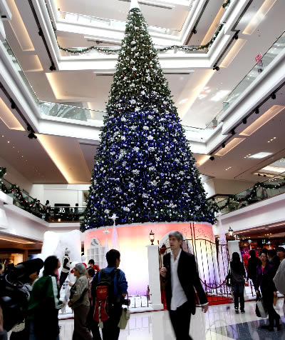 11月17日,在日本东京繁华的银座商业区,松屋百货大楼被用“路易·威登”的经典图案装扮成一只巨大的“路易·威登”旅行箱,以招徕顾客。 香港室内最高圣诞树亮相