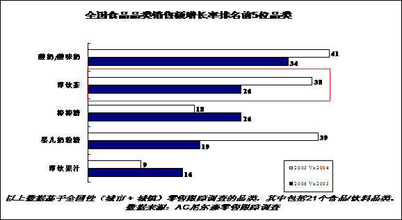 茶,在中国有悠久的历史。精通饮食之道的中国人更将茶演变成了文化——闻茶、品茶、水的选择、水温的控制等等,一壶浓香的茶是需要心思去泡制的。而从南到北,不同的地域、温差、饮食习惯也带动不同种类、口味的茶盛行。 当超市、大卖场充斥着各种新型饮料时,老百姓仍然难忘浓浓的茶香。生活节奏的加快,能花在茶盘前慢斟细酢的时间也越来越少。但茶确实其他饮料所不能取代的,除了它是受人们欢迎的一种好饮料外,还因为它对人体能起一定的保健和治疗作用。正如宋代诗人苏轼所言:“何须魏帝一丸药,且尽卢仝七碗茶。”茶能提神疗烦,解热止渴,消食除腻…… 近几年来,饮料行业可谓是新品层出不穷,各饮料商绞尽脑汁希望能用新颖的产品来吸引消费者目光,但即饮茶的出现却迅速捕获了消费者的心:健康概念、方便饮用。即饮茶可谓在饮料行业一支独秀,其销售额、销售量每年都有两位数的增长率。根据尼尔森零售跟踪调查,即饮茶的销售额2005年增长了38%,而2006年增长了26%, 位居全国销售额增长率排名第3位品类,是饮料业中最高速增长的品类。