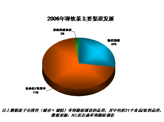 在即饮茶中,销售增长最快的是低糖型茶。近几年来,健康一直是中国市场的热门话题之一。中国的消费者对食品、饮品的要求越来越挑剔,甚至把健康饮食作为衡量生活水准的标准之一。“追求健康和自然 ”是大部分快速消费品厂商所面临的挑战。低糖型即饮茶的出现就符合了这一趋势。有趣的是,更健康的无糖型即饮茶反而被消费者接受的程度不是很高,可见中国消费者在追求健康食品的同时仍然不愿放弃口感所带来的享受。 由于即饮茶是解渴型饮料,因此对包装的需求是方便、便捷。目前来讲,小包装的即饮茶仍是主导,但有向大包装发展的潜力,特别是逢年过节,消费者对大包装即饮茶的需求不可忽视。 即饮茶的销售渠道以食杂店/售货亭为主,其市场贡献率占了70%;现代渠道的贡献率只达到27%。即饮茶的这种销售特点充分体现了消费者的需求:方便、快捷。遍布在大街小巷的食杂店、售货亭能够解决的是消费者即时需要。所以,对于生产商而言,如何合理铺货,以提高其渗透率是需要斟酌的。从全国范围来看,华东、华北和华南是即饮茶的最大销售市场。虽然,厂商将销售重点放在大城市上,尼尔森的零售数据显示,那些低线城市的销售额的增长率不可忽视。