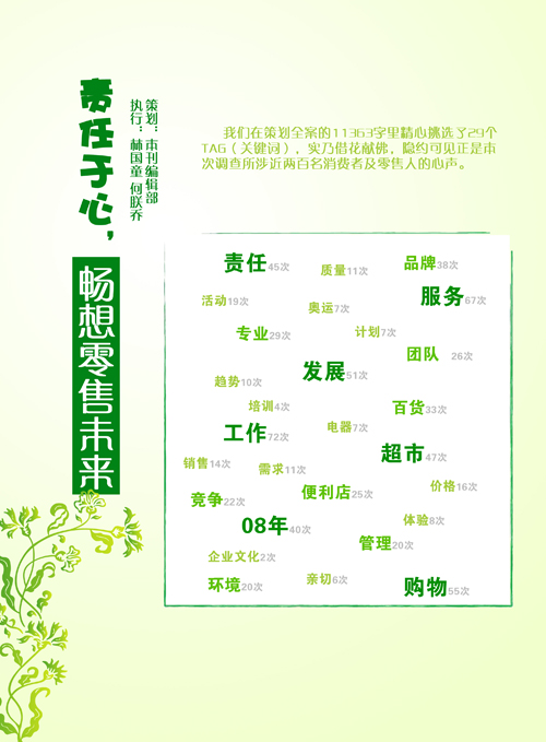Answer 回答(以下缩写为“A”) 百货 江苏启东文峰大世界有限公司 总经理吴险峰 A1:在我们店里,服务人员的工作职责还包括陪同顾客全程购物,给顾客需要的服务和选购意见,让每一位顾客都有愉悦的购物感觉。当然,我们在服务上还有很多特色措施,比如满意工程“1+1”,员工上门替顾客解决和家电有关的安装、调试、维修等问题。这些服务要想达到理想效果,责任感是必需的基本素质。 A2:07年的营业额比前一年增长,连锁规模进一步扩大,品牌价值不断提升。也有不少问题有待解决,零售业竞争很明朗,很多东西都是公开透明的,企业的成功秘笈无非是降低成本,提高营运能力。我们公司目前的劳动力成本支出就占了运营成本的三成,而且也面对激烈的市场竞争,所以今后的工作还是任重道远。 A3:尽管我们店的“春旺”受到了暴雪的影响——全国大多数地区的零售企业都因为天气灾害造成了一定的损失,但按照年初市场经营总体状况来看,08年似乎比07年会更好些。而且今年节假日政策开始调整,从前的两个黄金周、五个小长假总计一个月的购物旺季将会分散,再加上带薪休假制度的实施,实际上一般消费者的休假时间在原有基础上增加了半个月,这对商业来讲是比较好的契机。 A4:我希望自己能把握住市场机遇,解决运营过程中产生的困惑和难题,为我们企业的发展提供助推力。我一直关注三月份的联商网大会,同时也祝愿《店长》杂志和联商网发展得更好,能为我们这些零售人带来更多更有价值的行业信息和专业知识。