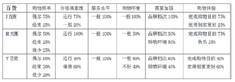 表1: 百货业态问卷调查分析表  据表1所示,消费者对百货业的服务水平和购物环境满意度偏低。接受调查的消费者中有七成人认为百货店亟需在品牌档次和种类上进行调整,结论显示,如何满足消费者个性化需求是百货商场不能忽视的问题。购物体验项的调查结果也不乐观,仅有10%左右的消费者在购物后感到快乐。