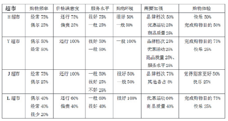 表2:超市业态问卷调查分析表  据表2所示,在服务水平和购物环境两项,超市业态得到多数消费者的肯定。关于超市业需要加强哪些方面的这项调查中,消费者的选择则较为分散,品牌档次、优惠活动、商品数量、服务水平都在消费者顾虑范围,如果超市企业在这些细节问题上能够考虑更加周全并严格执行,相信消费者在超市购物中获得的愉悦感也会随之提升。