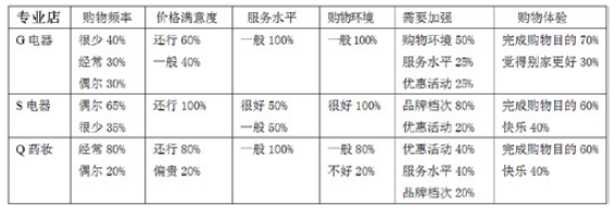 表3:专业店业态问卷调查分析表  据表3所示,消费者对各调查单项的满意指数大多只有一般,各家店获得的评价结果差异明显。优惠活动、购物环境、品牌档次等位居专业店需要加强方面的前三甲,但是消费者获得的购物快乐比例却是此次调查所涉及的多项零售业态中比例最高的。综合调查结果以及现场状况等因素,能得出以下结论:相比其他业态,专业店的主力消费群具有更为鲜明的群体特征,这些消费者对专业店的环境、服务、价格等也有更高的期望值,如何在现有基础上有所提升和发展,将是各类专业店都需要探索和解决的任务。