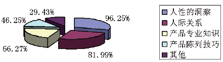 四、培训需求的分析  上图所示,96.25%的店员需要进行人性的洞察等系列课题进行培训,即需要进行人际关系学、消费心理学、九型人性等内容的通用性的知识培训;其次是人际关系处理技巧的通用性知识培训需求,再次才是产品专业知识及产品陈列技巧的产品相关的专业培训需求。