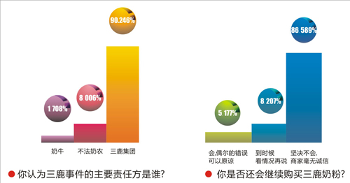 7494人 联商网在9月12日发起名为“如何看待三鹿奶粉受化学污染事件?”的投票,截至到 9月19日18时,短短一周时间,共有7494位联商网友参与投票,其中90.246%认为主要责任方在三鹿集团。17日,三鹿原董事长、总经理田文华被依法刑事拘留。