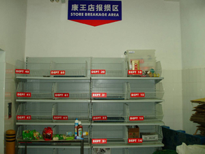 标识清晰 按部门、商品类别、提示与提醒。 家乐福康王店的报损区