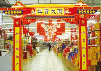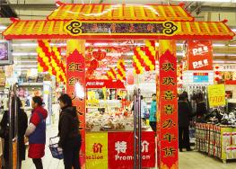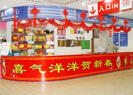 一、布置节庆场地 节庆布置的主要体现是在卖场的进出口以及几条主通道,考虑到我国的传统春节习性,当以红黄色调为主,醒目喜气,再配合各种中国元素,比如灯笼、花炮、财神、生肖图案,再加上欢快的卖场音乐,顾客一进门,自然觉得“年味”扑面而来。那些促销信息和广告语,看上去也赏心悦目,顾客心情舒畅,消费起来也就更加爽快。  图1 通道做成牌坊,一溜的标旗上写着迎春,“年货大街”顾名思义,集中了各种年货的区域,自然也是节庆期间消费者光顾的高频率区块啦!  图2 卖场主推的特价商品也要占据有利地形。 图3 卖场入口处是节庆布置的一个重点区域,绝对不能马虎,中国结、彩带、气球……能够烘托气氛的都要挂上去,当然成本控制也很重要。
