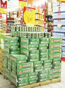 二、重点布置商品 老百姓春节期间最需要购买的当然是年货,比如干货(如红枣、桂圆礼盒、食用油等等)、休闲食品(如薯片、糖果、大礼包等等)、烟酒(如各类名酒礼盒等等),这些品类要多做文章,根据实际情况,尽量作为单品突破的着眼点,以提升人气,吸纳客流。堆头摆放要有间隔:太紧凑会分散顾客注意力,也会削弱商品促销的震撼力;货堆整齐排列,有条件者可以和厂家协商,派驻促销人员,达到更好的推销效果。 图4 啤酒尽管毛利不如礼品酒类,但是节庆期间的销售额也很可观,采用上述的布置方式,突出“特价”,照样吸引眼球!  图5 某知名白酒类的礼品盒装和黄酒、葡萄酒摆设在一起,色彩醒目,体现了促销这个主题。 这里有一个问题,假如卖场面积有限,如何让堆头效果达到视觉最佳,又不让顾客觉得空间狭窄? 笔者的方式就是把周边陈列的商品坚决撤下,只突出单品,一定要醒目,既能达到“万绿丛中一点红的”功效,又不会觉得过道拥挤。