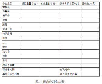 做分割实验的目的:一是为了建立部位肉占比,主要是要与销售后的部位肉占比做比较,找出差异点及造成差异的原因。如加工过程中的损耗过大、串码销售、还是无形的损耗等。另外可以查出部位肉占比的合理性,如分割技工下刀的方式是否正确,猪的品种是否优良,甚至还可以做为以后和供应商议价谈判的依据;二是为了产生《猪肉分割收益表》,进而合理定价,详见(图1)。