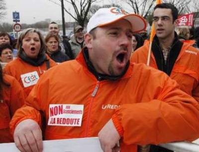 法国零售商遭遇员工集体示威游行 法国La Redoute公司员工与Les 3 Suisses 员工,联合高喊着口号向公司示威。上百名工作人员,他们或穿着制服、或举着旗帜和横幅聚集在法国北部Croix——Les 3 Suisses总部的门前高呼“反对公司大幅裁员!”