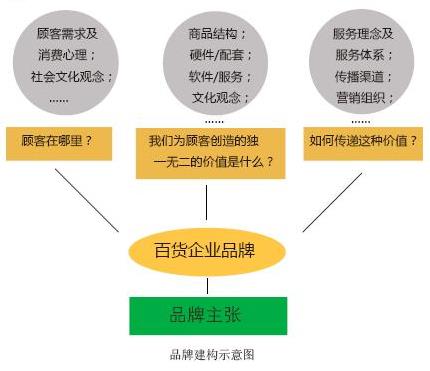 那么,百货企业的品牌如何建构?这是一个较为复杂的系统性工作,对此可谓仁者见仁、智者见智。在此,给出常用的思维结构示意图,以供参考:
