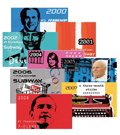 2005年 冠军特许经营商:赛百味 当年大事记: ◆赛百味制定目标:到2010年国际餐馆连锁开设7500家。 ◆视频网站YouTube登陆互联网。