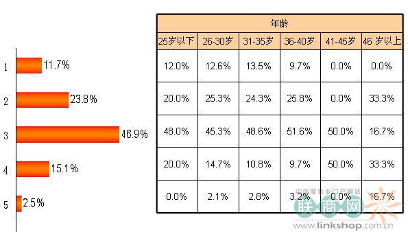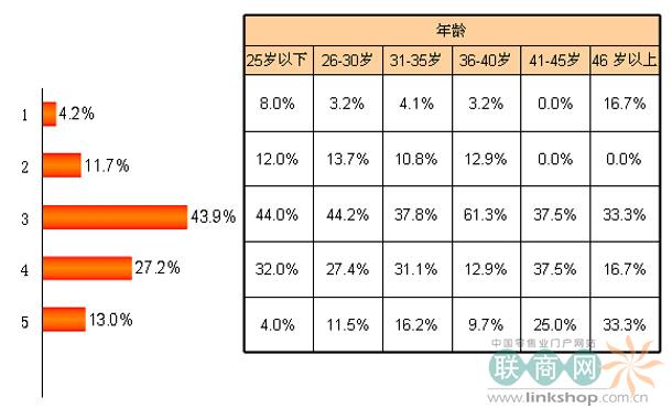 分析发现:压力指数高的,幸福指数也相对较高;男性、高学历、已婚店长的压力指数和 幸福指数相对较高;工作在大卖场、百货店的店长的压力指数和幸福指数都相对较高。 一、每周工作时间 分析发现:大部分零售店长每周的工作时间都超过40个小时,工作时间普遍较长,其中每 周工作时间超过70个小时的就有20.9%。 ![]() 二、压力指数 分析发现:40.2%的店长对目前的工作感觉压力很大;其中,女性的压力要大于男性; 已婚店长的压力大于单身店长的压力。 标准超市和大卖场店长的压力要比百货店店长的压力大。31~35岁店长的压力最大。 ![]() 三、幸福指数 分析发现:只有17.6%的店长,在自己目前工作岗位上可以感觉到比较幸福;25岁以下的 店长的幸福指数高于其他年龄段的店长的幸福指数。