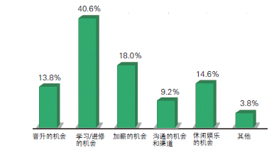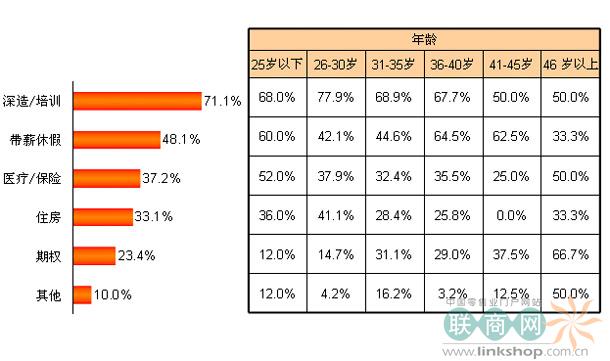 一、 对未来1年内现金报酬增幅的期望 分析发现:65.3%的店长希望未来12个月内现金报酬增加10%以上;各个业态的店长, 对自己未来12 个月内现金报酬增幅的期望大致相同;25岁以下的店长,期望自己未来12 个月内的现金报酬增幅最大。 ![]() 二、 对未来1年内非现金报酬增幅的期望(问卷上此问题为多选) 分析发现:未来12个月内,店长期望比例最大的非现金报酬是深造/培训;各个业态的店长 期望比例最大的非现金报酬都是深造/培训。 未来12个月内,25岁以下的店长期望的非现金报酬排名前三的依次是:深造/培训、带薪假 期和医疗/保险 。 ![]() 三、 店长认为在工作中最需要什么样的机会 分析发现:40.6%的店长认为目前工作中最需要的机会是学习/进修的机会;学习/进修的机 会是各业态和各个年龄段店长都十分需要的。 ![]() 四、店长对于工作首要考虑的因素 分析发现:对于工作首要考虑的方面排前三的依次是:工作挑战性、薪酬竞争力和 工作稳定性;29%的36-40岁的店长首要考虑的是工作稳定性。 ![]() 五、是否有跳槽的打算? 分析发现:单身的店长目前有跳槽倾向的比例较大。标准超市的店长目前有跳槽倾向的 比例相对较大。25岁以下的店长目前有跳槽倾向的比例相对偏高。