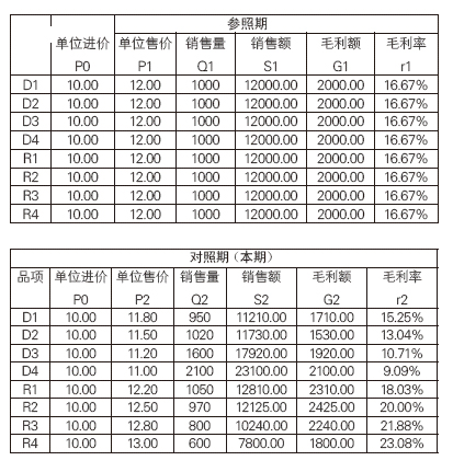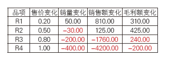 R3:价格提高了,虽然销量降低了,销售额也降低了,但毛利额还是增加了。 为什么呢?因为毛利率的提升幅度高于销售额的下降幅度。如下所示: