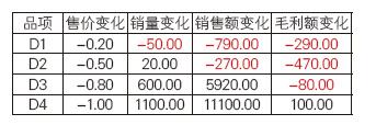 上一期文章,通过对价格带的分析,明晰了商品汰换与引进的方向与思路。这种调整不是简单的加减法或者新旧更替,而应先根据商品的价格敏感度,调整定价不合理的商品,并将其归集于相应的价格带。 这里所说的价格敏感度,是指在商品进价不变的前提下,调整(提高或者降低)商品价格对销售量、销售额、毛利率等的影响度。 我们来看某单品的案例表(参加下面两个图表):