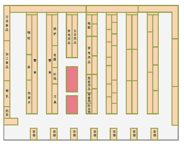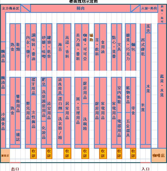 案例一:某面积721平米的卖场 近年来小型超市日益增多,在店铺坪数较小的卖场内,倒“L”型的主通道放不下所有的主力商品,因此必须将主通道延长成“ㄇ”字型。 该店主力商品的配置为:将购买频率最高的蔬果类商品放在主通道的前端,其次为精肉、水产、冷冻食品、乳制品等沿着墙壁一直延伸至出口端。 而主力以外的食品(准主力商品)是与消费者的正餐关联较深的类别,集中于入口附近的位置,如楼面规划示意图中A的部分。而B的部分则是以休闲食品为主,像咖啡、茶、包装水等顾客购买频率较高的商品非常适合陈列于面向主通道的货架上。由于面向主通道的货架是销售商品的绝佳战略位置,若有其他回转率高的商品也建议放在这个位置。 对一般超市而言,辅助商品所指的是非食品的杂货。以该店的配置来看,杂货被摆在卖场中央,目的是希望顾客漫步在主力、准主力商品区的同时也能够注意到这些辅助商品,引发顾客的购买欲望,或是提醒顾客想起购买这些商品的必要性。 另外,在卖场中央偏左的区域有设置特卖专区,该区的设置是为了让卖场经常有所变化。而特卖专区陈列的重点在于,必须展现出丰富的商品数量,并且每周更换该区的陈列。特卖专区的活用方式会影响杂货区的来客数,可以说是吸引顾客进入杂货区的门户。 案例二:某面积1488平米的卖场 该店主力商品的配置是将顾客购买频率最高的蔬果类商品放在主通道的前端,其次为乳制品、火腿/热狗、精肉、水产、冷冻食品、乳制品等,沿着墙壁一路延伸至出口端。 而主力以外的食品(准主力商品)则是以店中央的横向走道为界,陈列于店内侧的货架。这是为了要让逛完主通道的顾客再次走到店的内侧。 楼面规划示意图中的A区域是顾客购买频率较高的区域,陈列的商品大部分是与消费者正餐较有关的类别,同时将非食品的服饰也设置在该区域里,主要是希望藉此引起消费者的购买欲望。而B区域里则主要为点心、零食等。把文具设置于糖果、巧克力对面的货架上,是考虑到要将该区设定为儿童区。 该店的辅助商品是非食品的杂货以及部分的服饰品。杂货商品配置于店中央横向走道与收银区之间的货架。该店的辅助商品区,是顾客逛完主通道后进入横向走道,再逛完A、B区之后,迈向收银台时的最终区域。 另外,中央横向走道的设计也能够让顾客依自己购物的顺序自由地在店内穿梭。 |