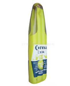 1.充气酒瓶浮排共由多片PVC组成,印刷部位采用丝网印刷工艺印刷上各种图案后裁成方片,其它部位由裁剪部裁成方片。 2.将裁好的印刷料上用高周波机器电压上充气气咀后,再将每片材料用 高频机电压溶接在一起,做成充气酒瓶浮排形状。 3.由生产部门做好的充气酒瓶浮排成品,再经品检部门进行充气全检,如果在充气12-24小时后气压正常,将由放气工人对印刷等进行质量进行检验, 再进行放气,拿到包装部包装。