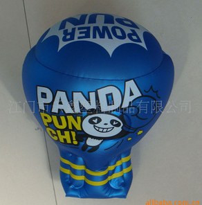 产品名称: 充气拳击套 产品材质: PVC软质薄膜 材质厚度: 0.18mm(可定做0.15-0.3mm的厚度) 材质标准: EN-71标准或F963标准或环保6P标准 材质颜色: 可定做任一颜色 产品图案: 可印刷任一矢量图形和位图 产品重量: 30-1000g/PCS 产品包装: 产品包装:简易包装(可按客人要求包装)