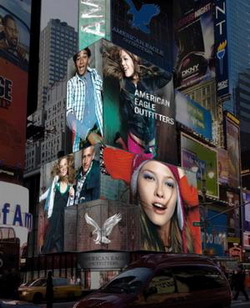 巨鹰服饰于11月中旬在百老汇金和时代广场46号大街开开设了旗舰店。利用其独一无二的地理位置,这家专业服饰零售商还在大楼外墙上安装了一个25层楼高、15,000平方英尺的数字显示屏。商店利用该设备推出其“5秒明星”活动,给前来购买商品的消费者一个亮相于大荧屏的机会,并附带20字的个人信息介绍,如此巨大的屏幕可以让整个时代广场的人们都能看到。当然,该消费者还会受到商店赠送的塑料纪念照片做留念。