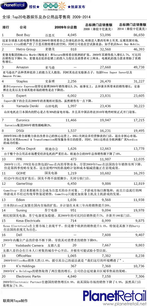 Planet Retail:总部位于英国伦敦,是全球领先的零售研究公司,致力于最新的全球零售咨讯,及零售商资料与数据。全球排名前20的消费品企业,零售商,技术及金融咨询公司大部分都已是其客户。详询www.planetretail.net