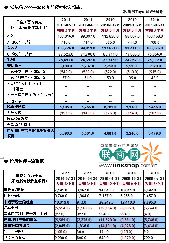 沃尔玛阶段性收入以及现金流最新数据