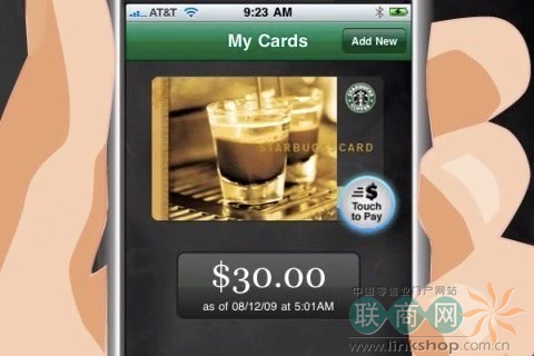星巴克的支付应用程序app可在苹果的App Store免费下载,允许顾客将信用卡上的钱转移至星巴克卡上。打开安装在iPhone或ipod touch上的程序会出现一个用于结账的条形码,只要交给收银员刷一下就能轻松实现付款。