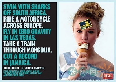 意大利服饰大牌Diesel最近推出了一个名为“傻气大比拼”的竞赛。只要消费者前往指定的Diesel连锁店索取一张“变傻”的贴纸贴在额头上,然后拍照上传自己的傻样,写一段不少于140字引人发笑的蠢故事就行了,获胜的消费者可以得到意想不到的大礼——与鲨鱼共浴大海、骑摩托横穿欧洲或是享受无重力飞行!
