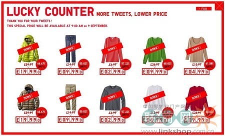 “LUCKY COUNTER”的玩法也很酷。参加活动的网友只要在UNIQLO提供10个品项中挑选出想要的物件,透过twitter传递出去,越多人发表价格就会越低,且在新官网重新上线时,还可以最后下杀的价格买到你想要的衣服。这个集体杀价的行销手法,不但造成相当大的反响,也为UNIQLO UK新官网的宣传带来不可小覷的贡献。日后预计也会在其他国家的官网上操作这样的活动。