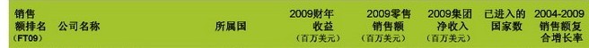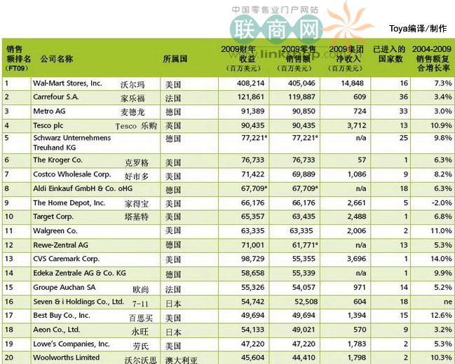 Deloitt于2011年初发布了《全球零售动力2011》报告,该报告综合了全球领先的零售商09财年销售额数据排名出TOP250强零售商。其中有五家来自于中国大陆的零售商入围。 以下为TOP 20零售商排名: