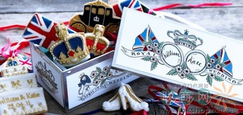 有一家伦敦手工饼干零售店Biscuiteer,推出限量王室婚礼饼干礼盒,每盒售价40英镑,铁盒上印有威廉与凯特的名字和结婚日期,内有4层不同造型的彩色饼干,非常可爱。