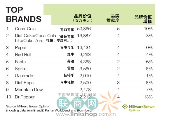 BrandZ Top 100最具价值的全球品牌排行采取了最综合的品牌价值评定法,由 Millward Brown Optimor每年研究发布,上图为最有品牌价值的软饮品牌排行。