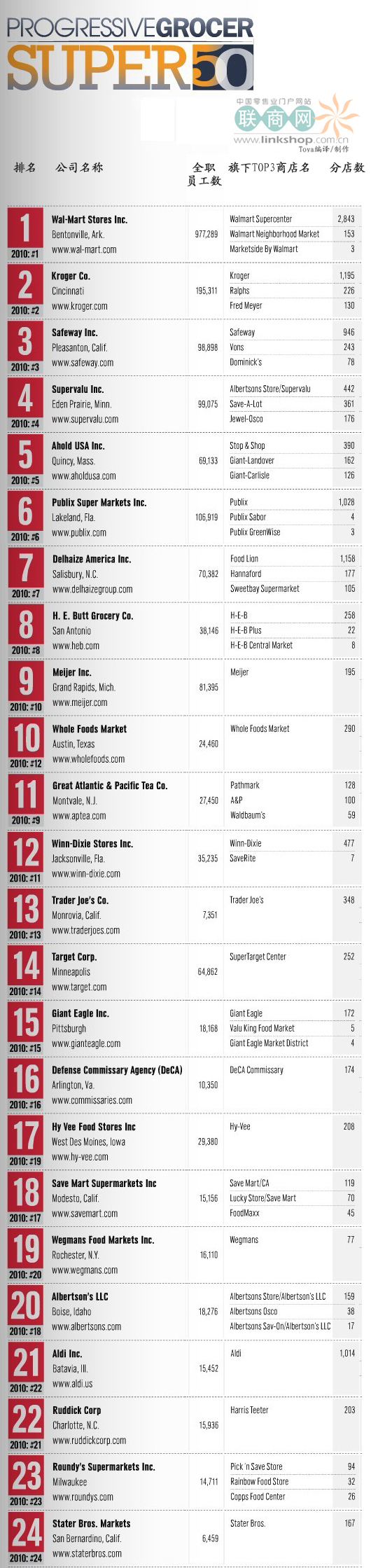 《PROGRESSIVE GROCER》本月发布了全美TOP50超市榜单,稳居第一的依然是沃尔玛,在前十强中,前8名的排名和去年榜单保持一致。