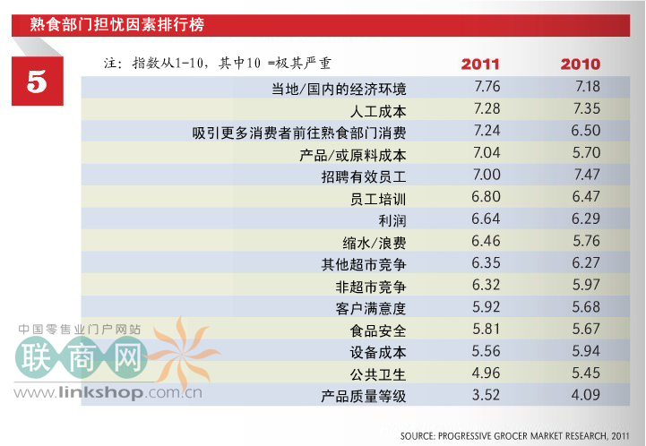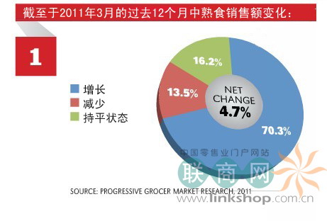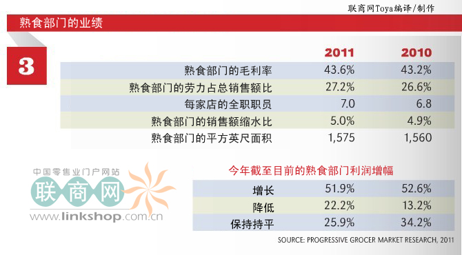 根据“Progressive Grocer's 2011超市熟食运作”调查显示,在超市内提供充足够新鲜的熟食供应有助于促进商家更高的销售额,同时还能维系消费者忠诚度。