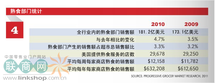 在全美范围内约有29678家店内熟食店,在2011年预计总的熟食部门销售额有望达到181.2亿美元,高出去年同期5个百分点。与店内其他部门相比,来自于熟食的销售额平均占其所在超市总销售额3.3%的比重。