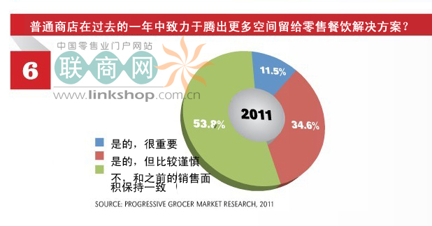 接近半数有熟食部门的受访零售商对此表示肯定,称他们在过去的一年里为零售餐饮而努力扩大器销售空间面积。尽管不少消费者开始回归经济萧条之前长光顾的餐厅,超市熟食部门的即食食品持续增长,因为当下的消费者依然认为超市的熟食区等于快捷、方便的用餐选择方式。