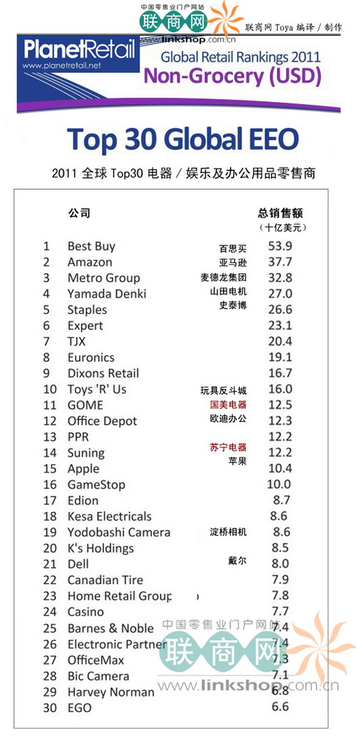 Planet Retail授权联商网发布了2011年全球TOP 30 EEO 零售商榜单——(EEO:Electronics, Entertainment and Office Supplies,即电器,娱乐及办公用品)。其中百思买依然稳坐该分类中老大的宝座,而去年排名第三的亚马逊今年赶超麦德龙攀上亚军的位置。