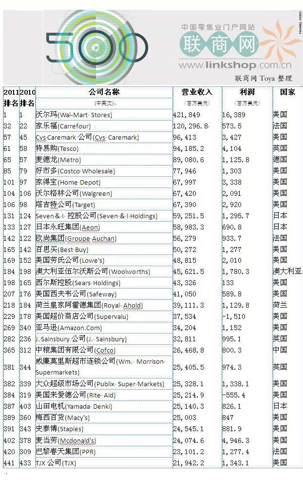2011年全球《财富》世界500强排行榜中的零售商,排在沃尔玛之后的还是法国家乐福,而日本的7-11、永旺及山田电机分别排在131、133、387位。