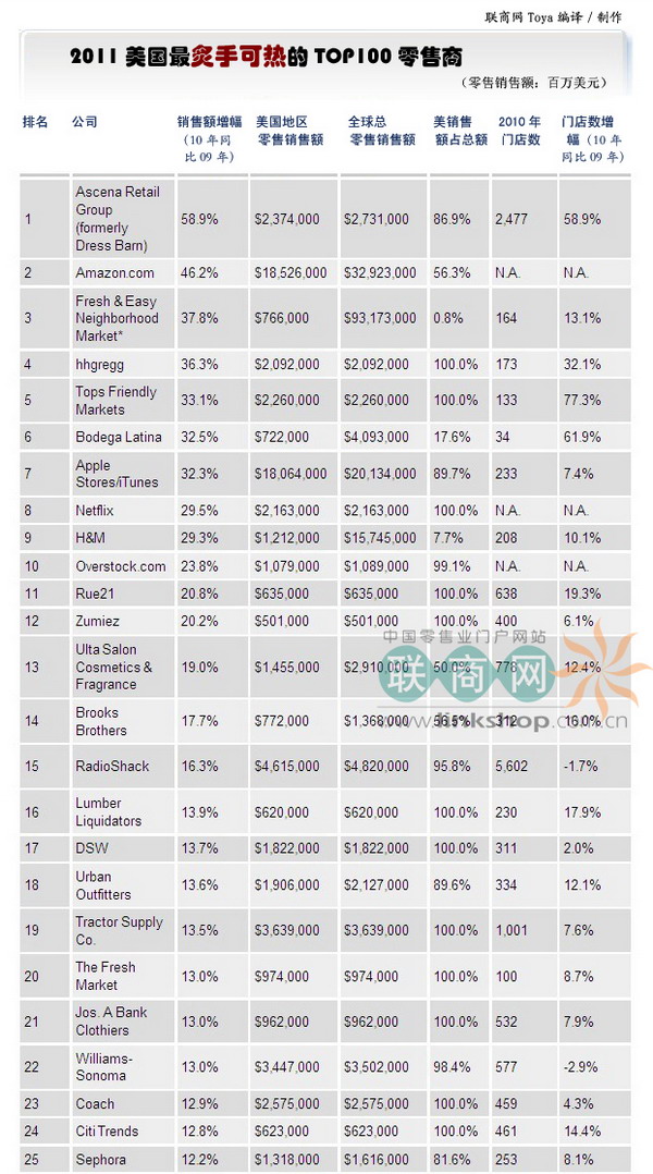 榜单参照零售商2010年同比2009年在美国地区的销售额增幅为排序依据。调查公司筛选了在美国地区年销售额超过3亿美元的所有零售企业。