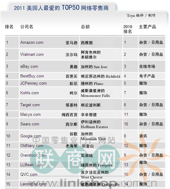 美国零售专业杂志《STORES》在9月刊发布了第五届美国网络零售年度排行榜——该榜单折射出在美国消费者心目中最受欢迎的商家,因为一切由受访消费者评定说了算。