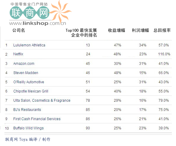 美国《财富》杂志近日公布了2011年全球发展最快的100家企业,排名参考了公司近3年的收益增长率、利润增长率及总投资回报率三方因素。