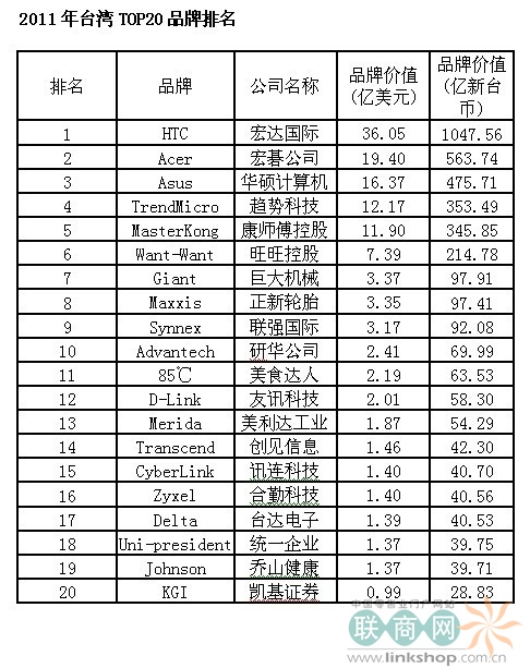 品牌顾问公司Interbrand承办的“2011年台湾TOP20品牌”颁奖典礼上,HTC以36.05亿美元的价值,首度拿下台湾20大国际品牌冠军宝座。而餐饮连锁85℃则位居11位。统一企业位居18。