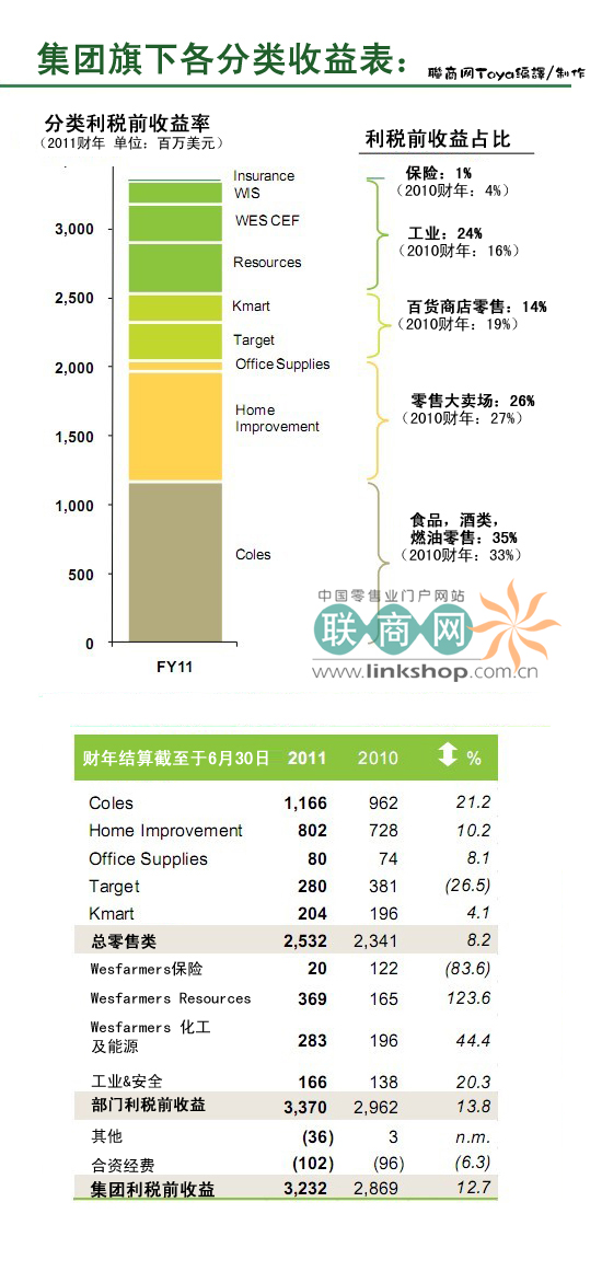 以下为联商网Toya根据Wesfarmers Group 2011年财报整理出的集团综合数据+主力零售商Coles超市的数据。