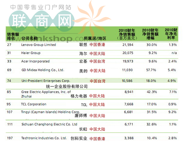德勤发布的全球250强消费品公司榜单中的中国公司(包括港澳台地区)。