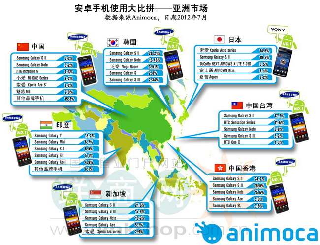 游戏开发商Animoca对其上千万名使用Android手机的用户进行了调查,并发布2012年7月亚洲各国/地区,安卓手机使用品牌榜(包括品牌的型号)