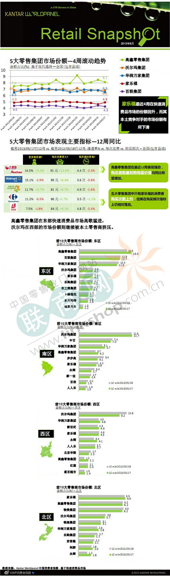 家乐福最近4周在快速消费品市场的份额回升,而其本土竞争对手的市场份额有所下滑。高鑫零售集团在最近12周表现强劲,购买者数量和购物篮价值均同比明显增加。