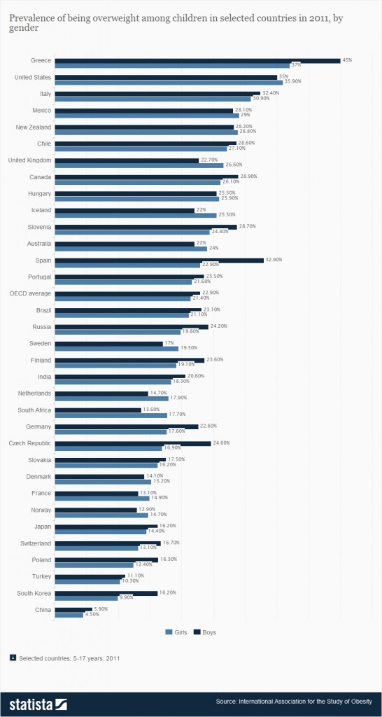 根据International Association for the Study of Obesit的数据,希腊,美国儿童体重过胖的比例最高,中国目前还好。